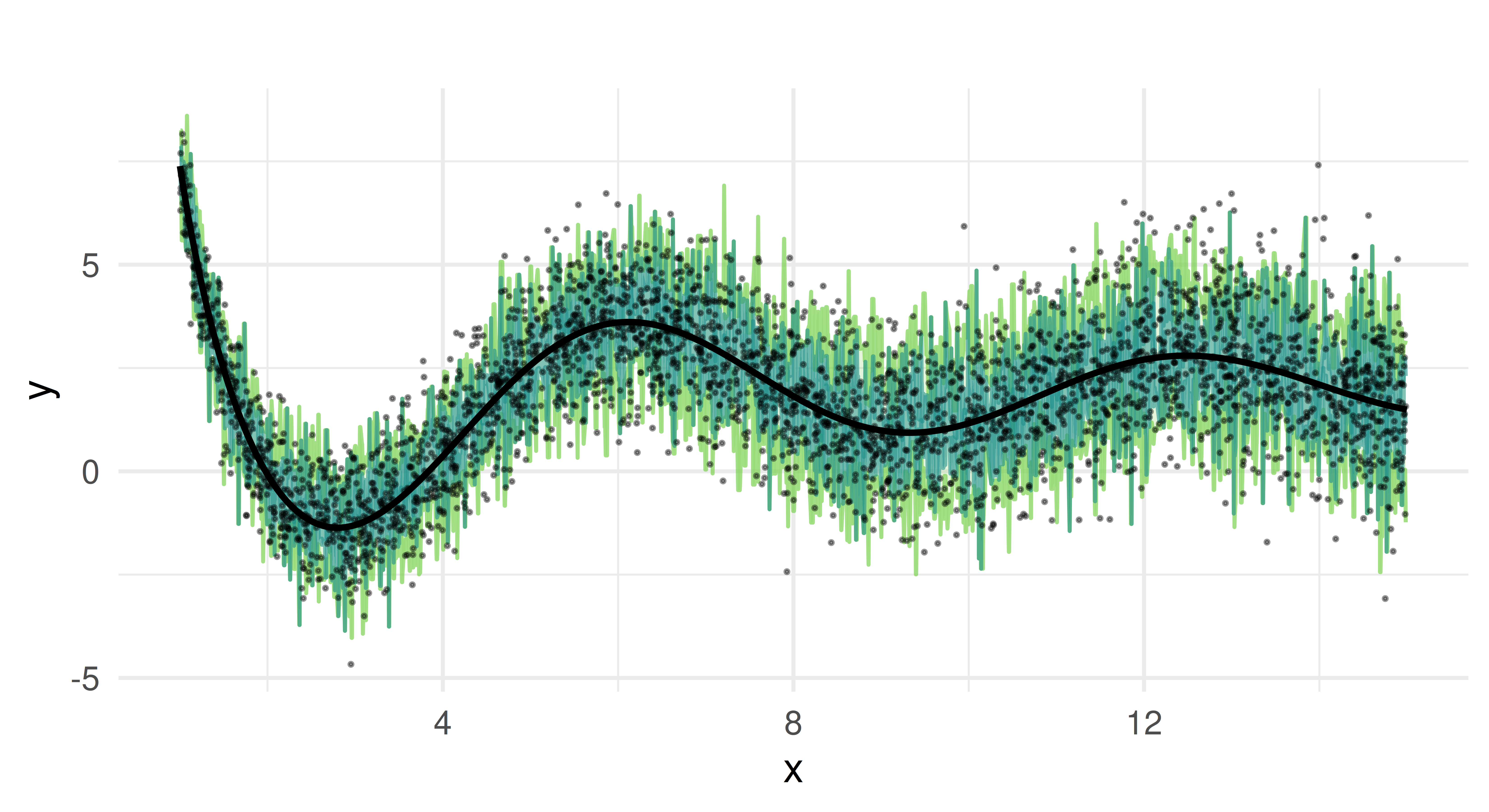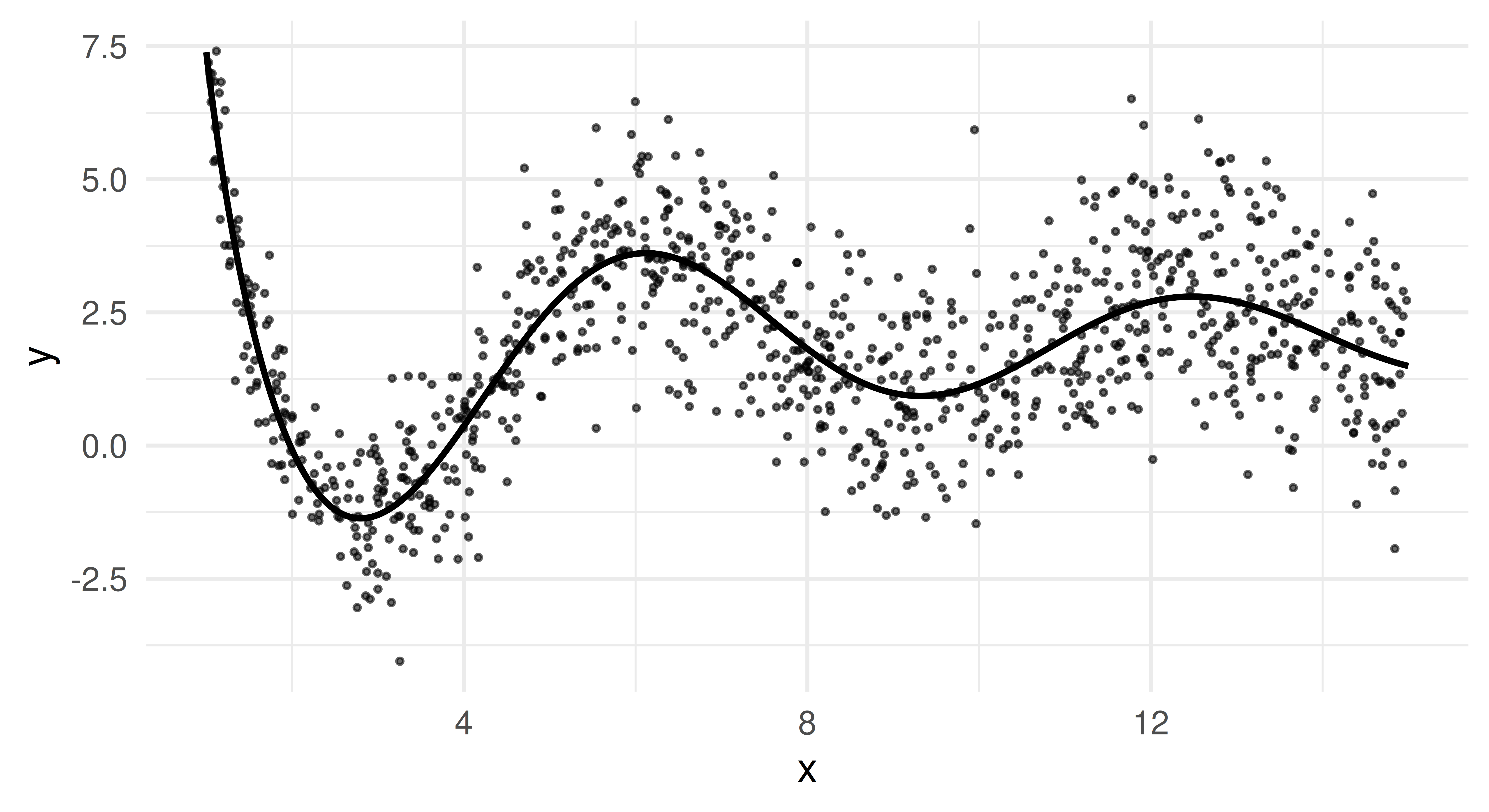 This plot reveals two essential properties of our data. Firstly, \(f(x)\) oscillates more for small x but becomes smoother for larger values. Secondly, we clearly see heteroscedasticity as the variance of y increases as x grows.