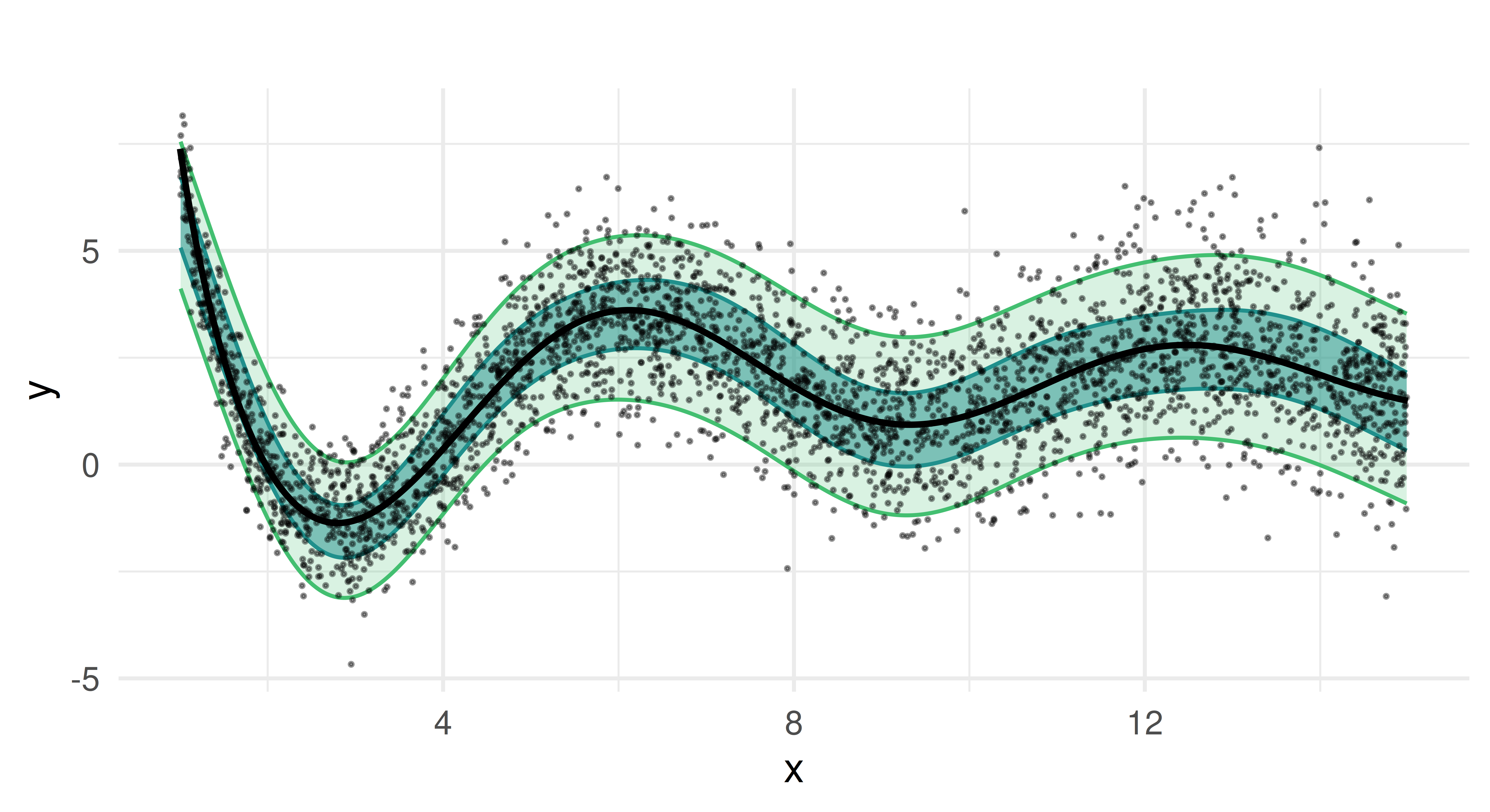Because of the latter, mean-based models will struggle to provide robust predictions, especially for larger values of x, as they will be heavily influenced by extreme deviations. In contrast, the median (0.5-quantile) provides a more stable estimate, while other quantiles (e.g., 0.05 and 0.95) allow us to estimate uncertainty and extreme outcomes.