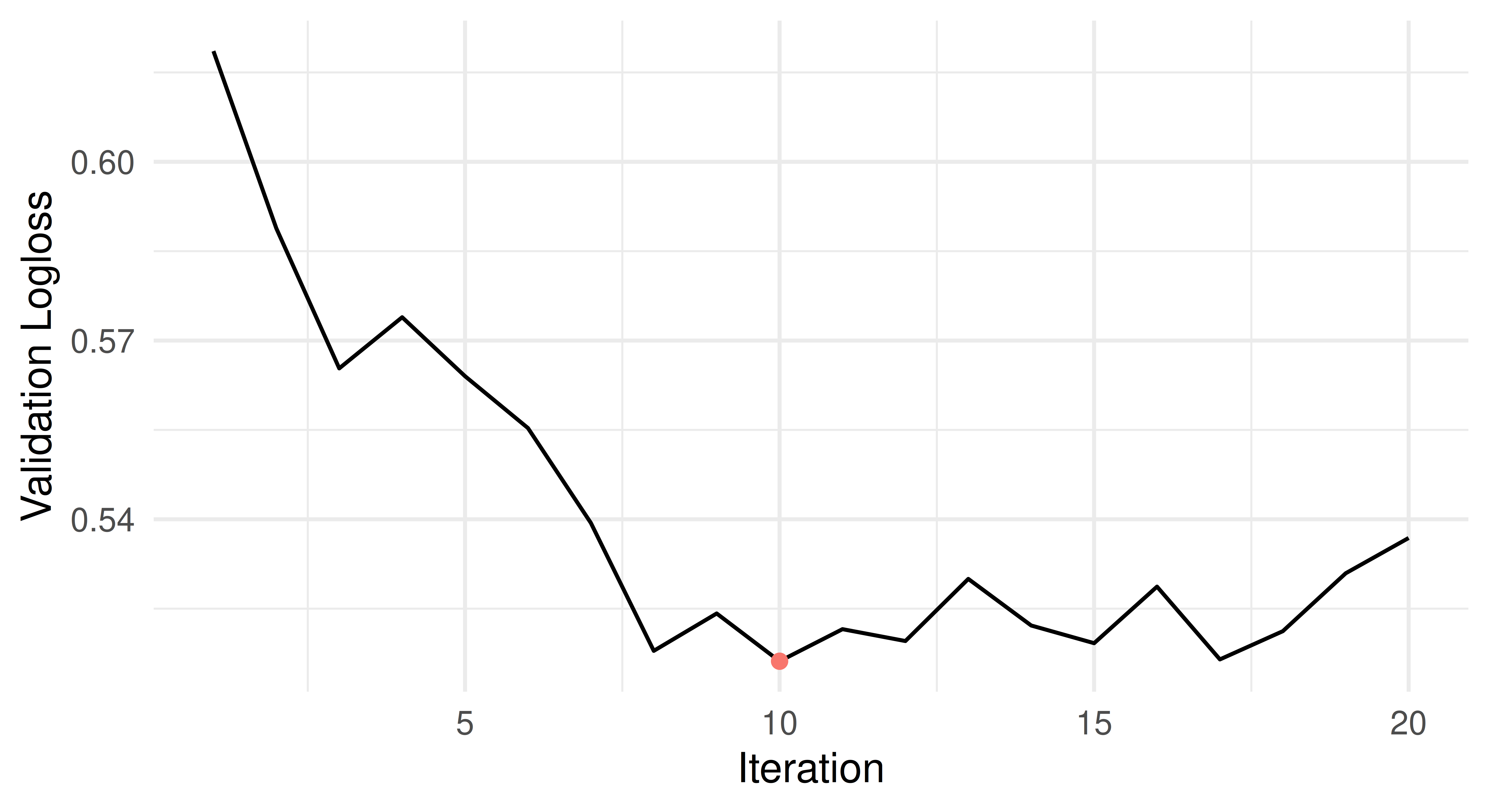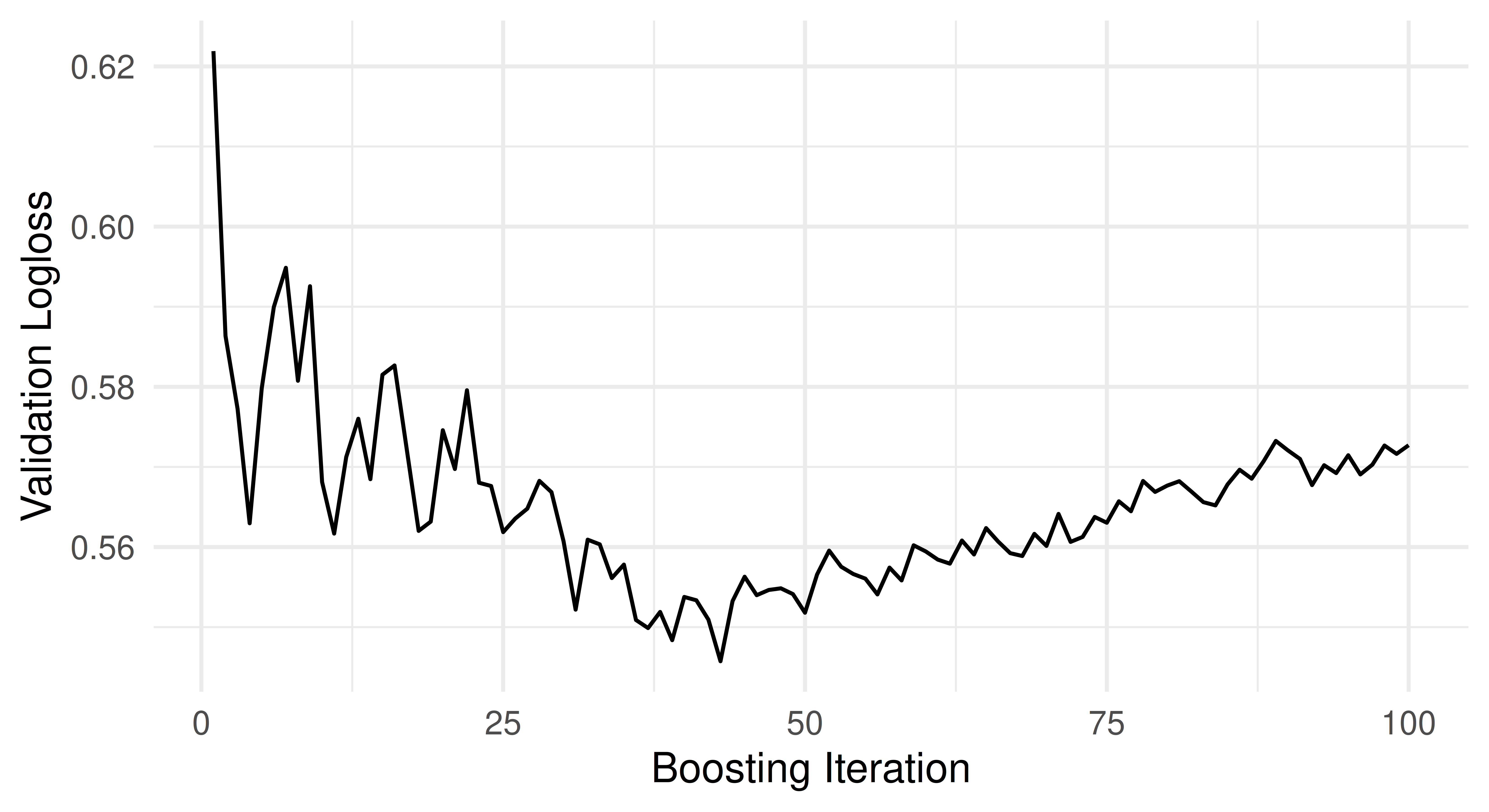 The validation loss over time is visualized in the figure below, with the iterations on the x-axis and the validation logloss on the y-axis: