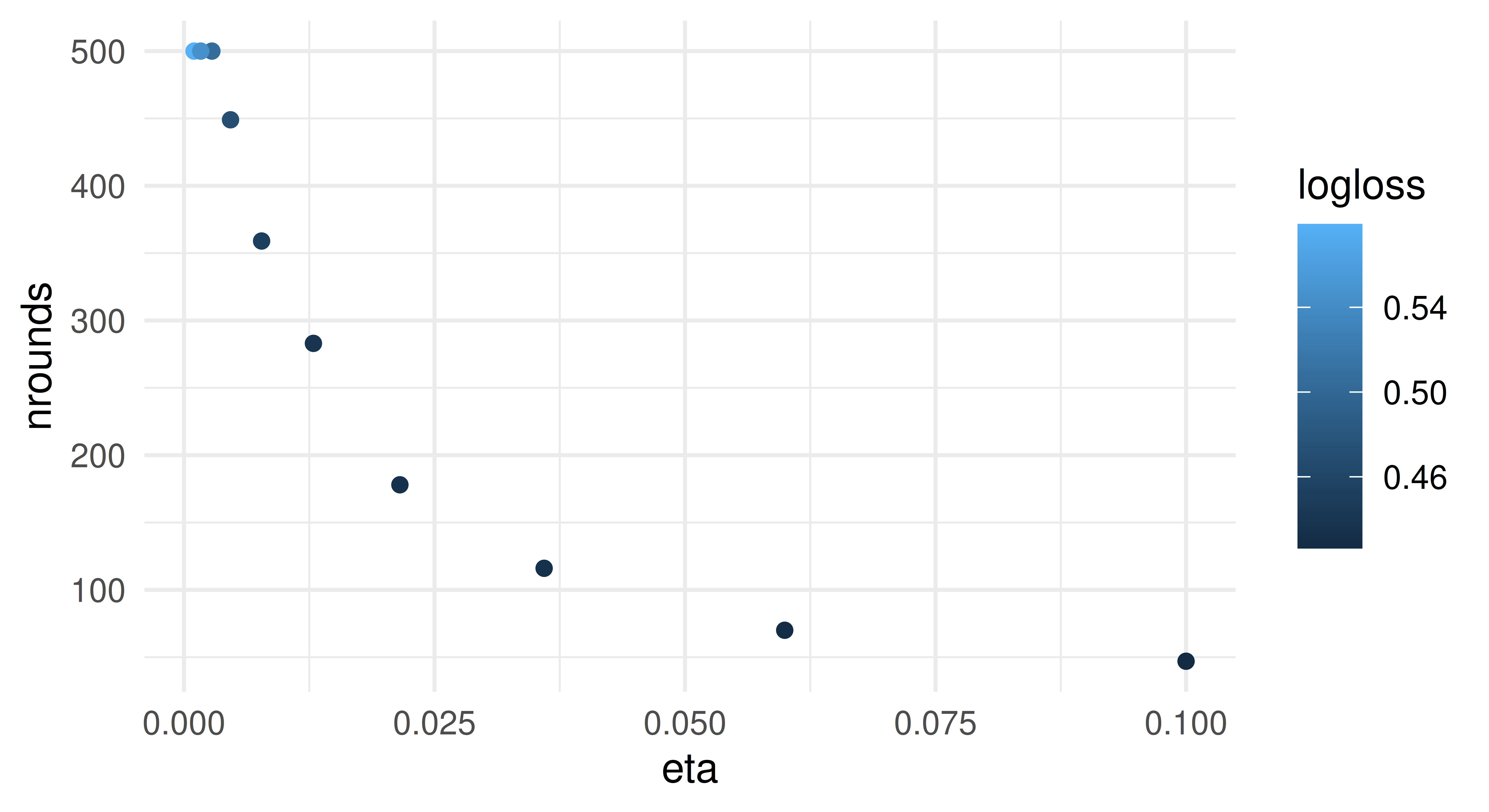 ggplot(data = d, aes(x = eta, y = nrounds, color = logloss)) +
